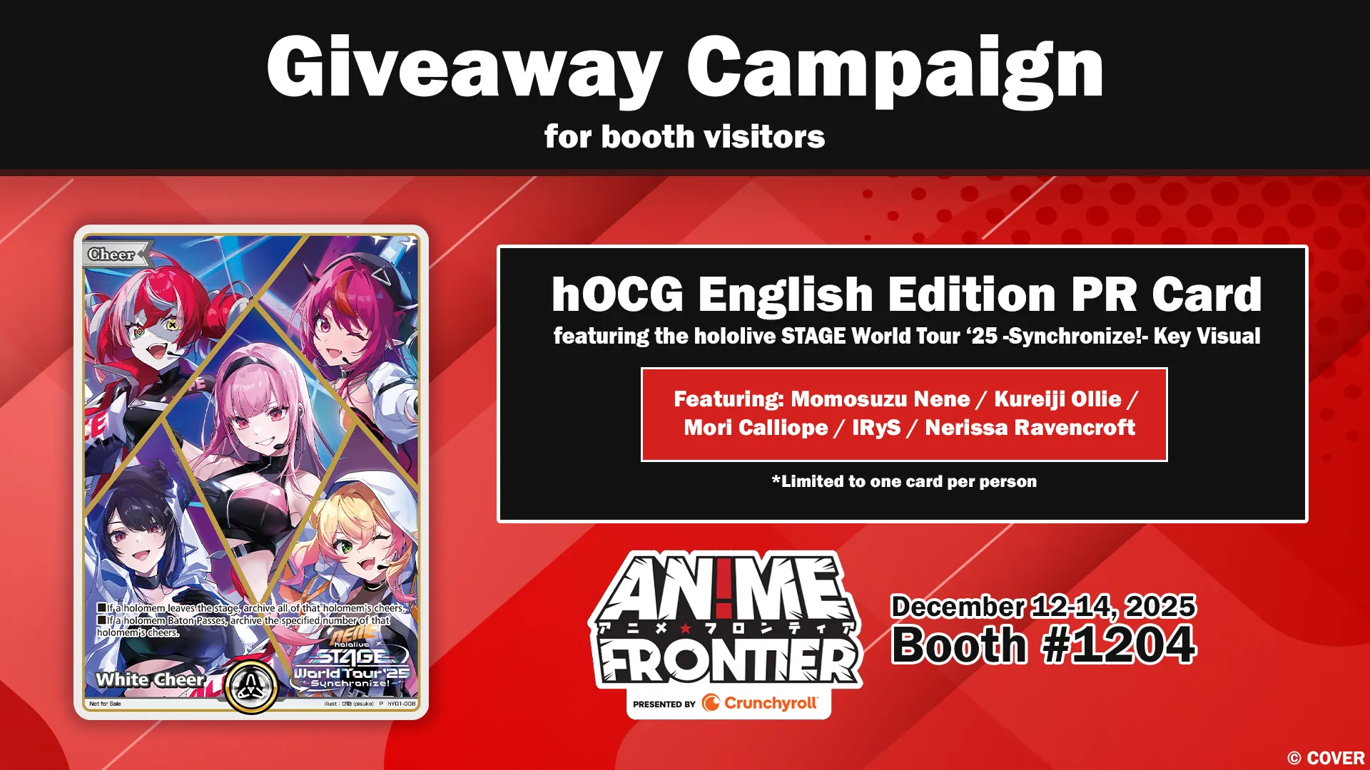 An event-exclusive hololive OFFICIAL CARD GAME English Edition PR Card featuring the hololive STAGE World Tour ‘25 -Synchronize!- Key Visual will be distributed to booth visitors as a special thank you to hololive production and TCG enthusiasts alike.